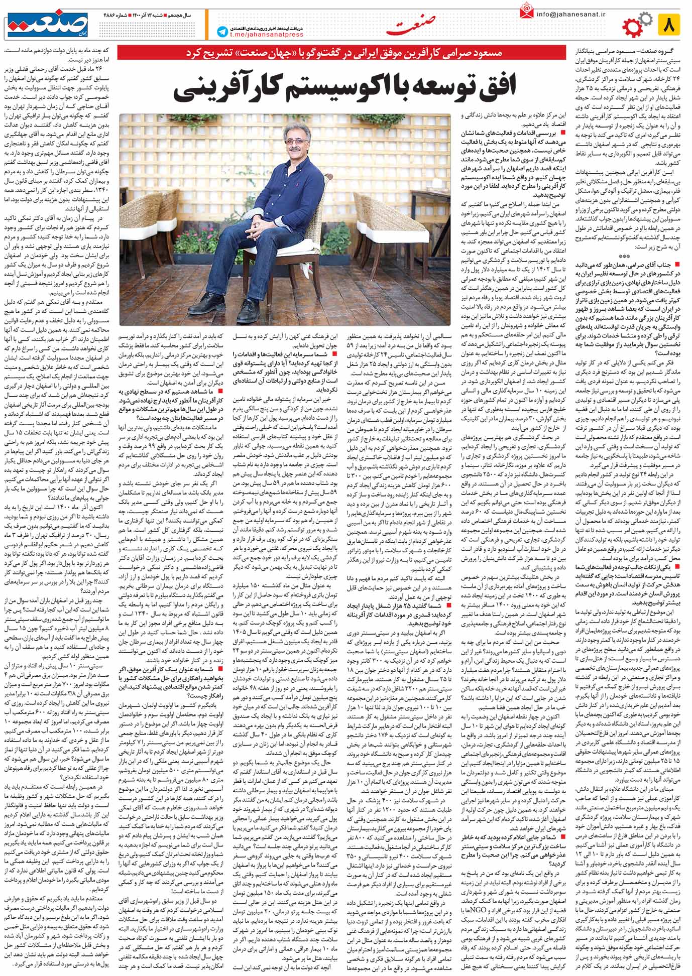 صنعت- مسعود صرامی بنیانگذار سیتیسنتر اصفهان از جمله کارآفرینان موفق ایران است که با احداث پروژههای متعددی نظیر احداث ۲۴ کارخانه، شهرک سلامت و مراکز گردشگری، فرهنگی، تفریحی و درمانی نزدیک به ۲۵ هزار شغل پایدار در این شهر ایجاد کرده است. حیطه فعالیتهای او از این نظر گسترده است که وی اعتقاد به ایجاد یک اکوسیستم کارآفرینی داشته و آن را به عنوان یک زنجیره از توسعه پایدار در نظر میگیرد؛ امری که تاکید میکند با توجه به بهرهوری و نتایجی که در شهر اصفهان داشته میتواند قابل تعمیم و الگوبرداری به سایر نقاط کشور باشد.